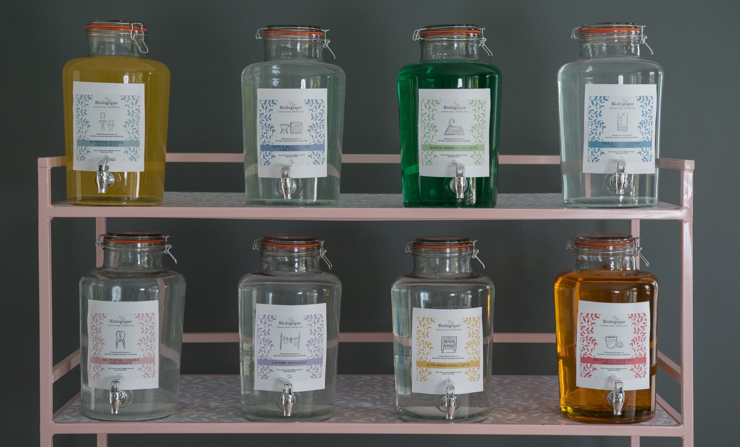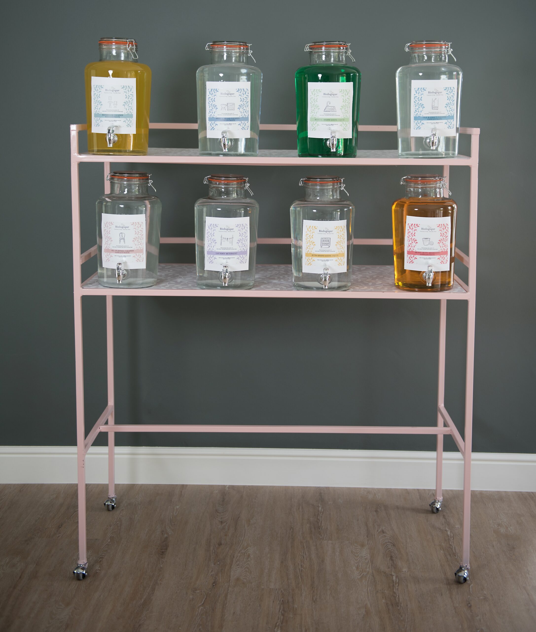 Display Unit  (1228mmL x 560mm W x 1445H) Mild Steel Structure on wheels with 6 x 7L Glass Refill Containers, excluding cleaning product.    The new package free is here.  We know plastic is bad for our environment, and we are always trying to reduce our plastic use as much as possible.  That’s why zero waste living is becoming more and more popular all the time.  Our products are ideally suitable to offer solutions to those who are thinking about or are already offering Package Free shopping.